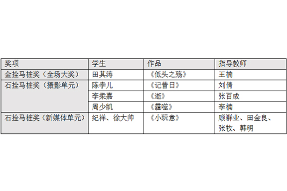 此次艺术节我院斩获了多个奖项,摄影专业田其涛同学荣获了全场唯一大奖金拴马桩奖,陈孛儿、李柔嘉、周少凯荣获摄影单元石拴马桩奖,纪祥、徐大帅荣获新媒体单元石拴马桩奖,我院被评为最佳组织奖,获奖作品指导教师均获得优秀指导教师奖。