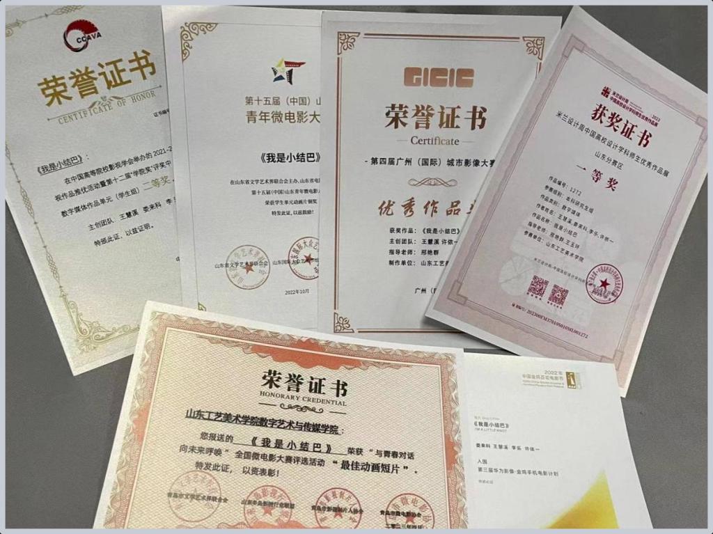 该作品先后获得2023年全国微电影大赛“最佳动画短片”奖、第十二届“学院奖 ”获得动画数字媒体作品单元二等奖、第十五届(中国)山东青年微电影大赛学生单元动画片铜奖等多项奖项;先后入选2022年中国金鸡百花电影节华为影像电影计划、2022年北京国际电影节大学生原创影片单元等。部分获奖证书如下:
