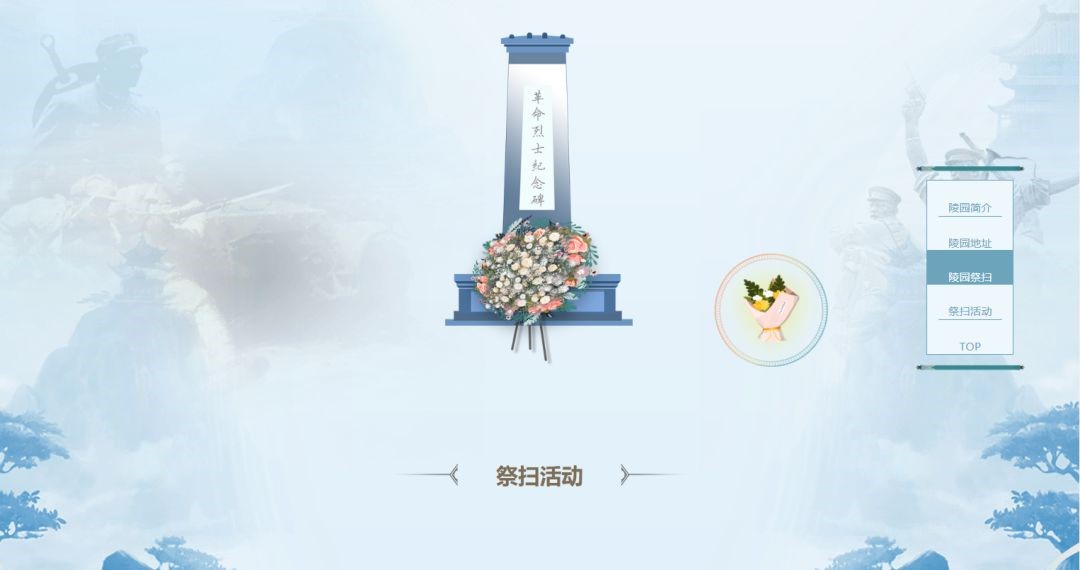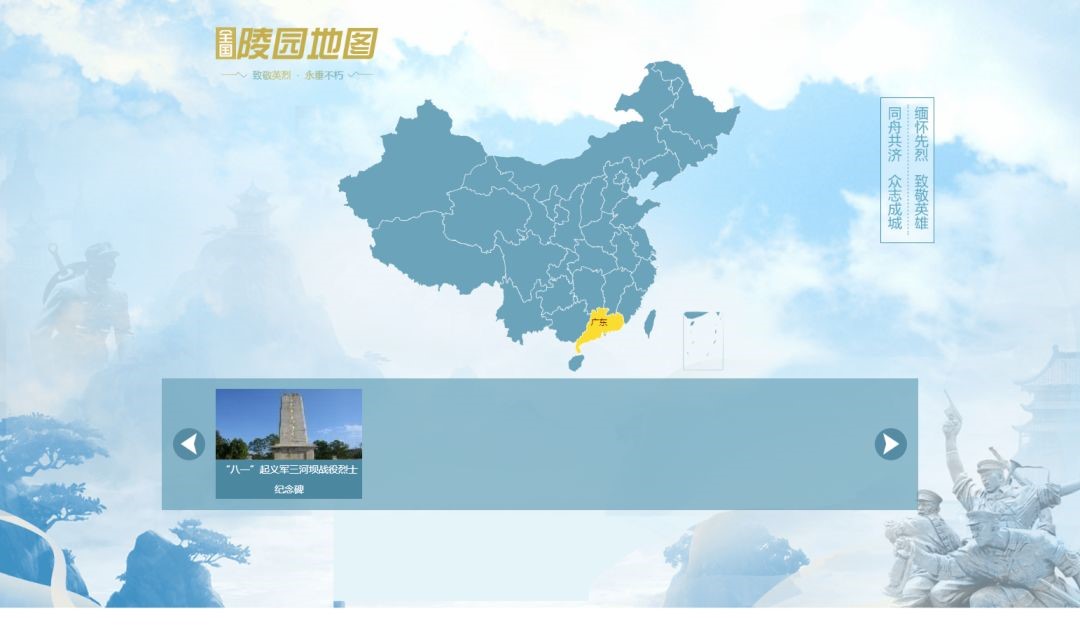 四、可点击“足不出户,进入陵园扫墓”,可搜索全国的烈士陵园以及详细介绍和地理位置,并可以在线为陵园献花。