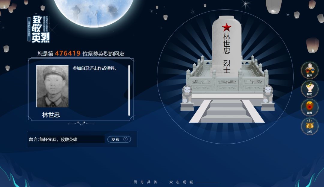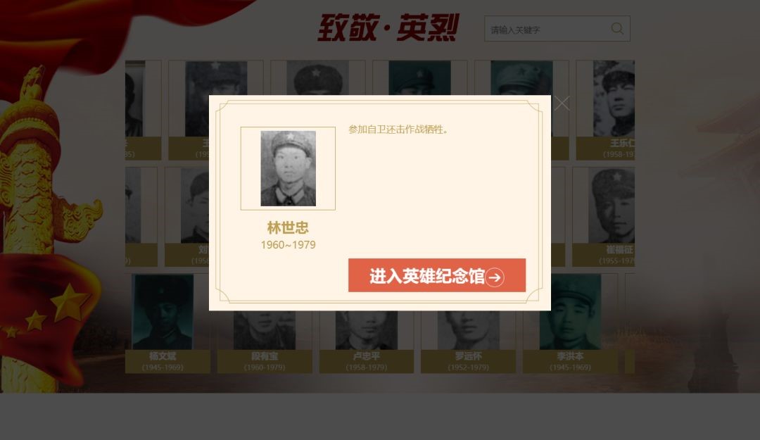 三、点击“进入英烈纪念馆”,进入可搜索英烈姓名。然后再次点击“进入英雄纪念馆”,可在右侧选择献花、祭拜等操作,也可以给英烈写寄语。