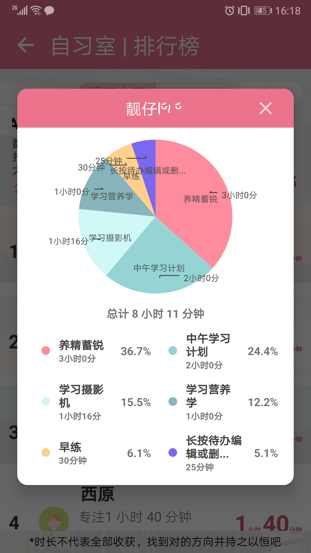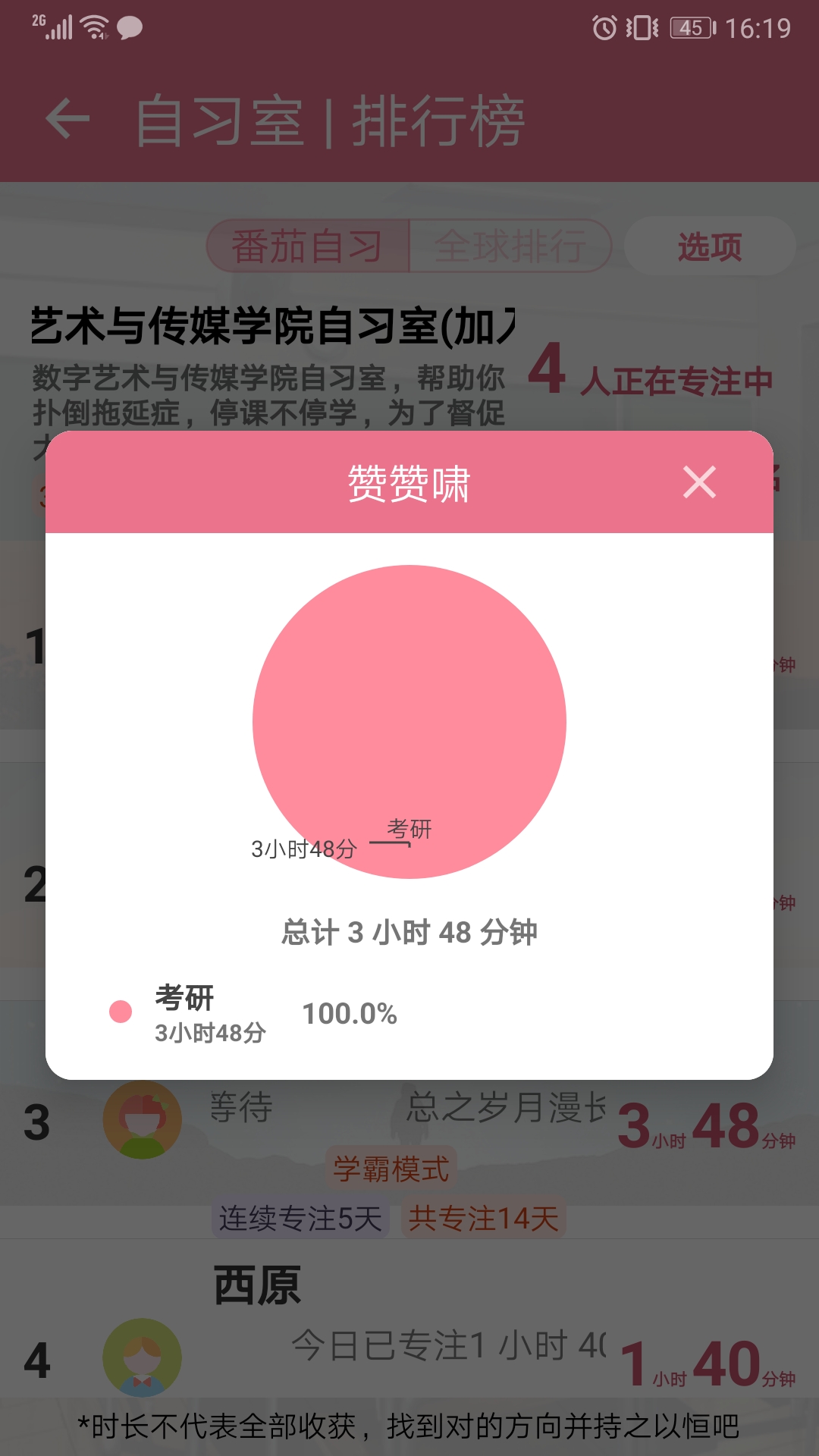 目前,在自习室推出24小时内,已有数百人次先后加入自习室进行学习。不少同学利用自习室时间表,为自己制定了细致的每日计划,比如网名“靓仔”同学的每日计划包括了早练30分钟、中午学习计划2小时、学习摄影机1小时、学习营养学1小时、养精蓄锐3小时,涵盖了学习、体育锻炼、业余爱好、休闲娱乐各个方面,成为“数字艺术与传媒学院自习室”名副其实的“学霸”。