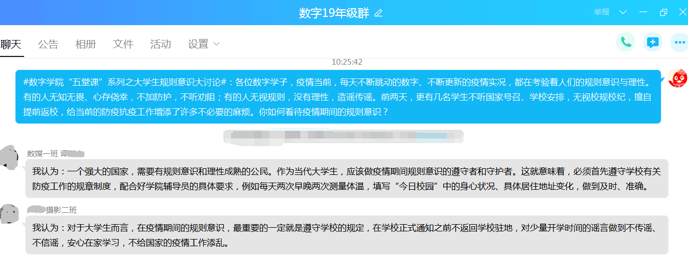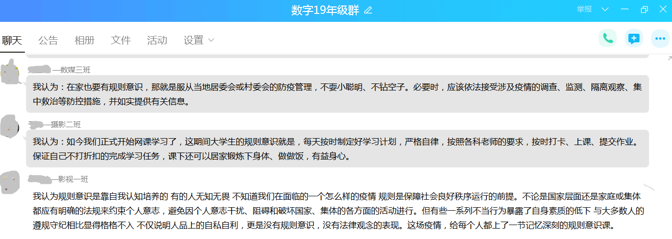 为了积极响应我校学生工作部《关于在全校大学生中开展新冠肺炎疫情‘五堂课’活动的通知》,引导当代大学生在疫情期间思考规则、遵守规则、做规则的拥护者,3月5日上午,数字艺术与传媒学院2019级辅导员郑静借助年级QQ群,在线发起了一次“大学生规则意识大讨论”。