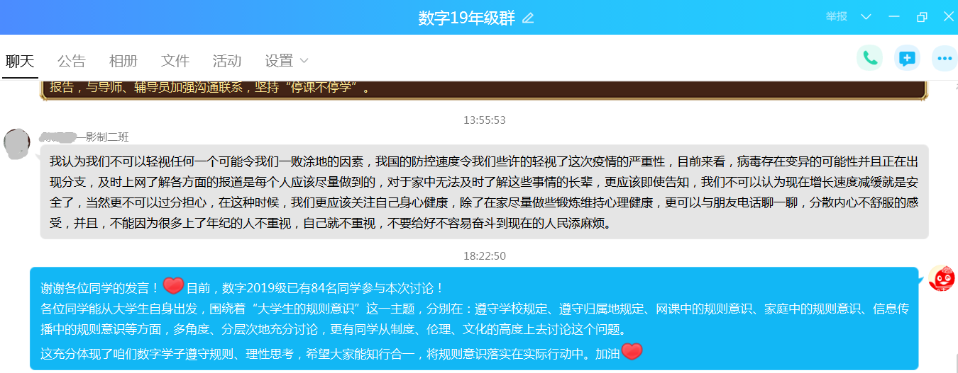 在3个小时内,2019级共有84名大学生参与了本次讨论。不少学生的发言相当精彩,能够立足大学生实际,围绕着“大学生规则意识”这一主题,分别从遵守学校规定、遵守归属地规定、网课学习中的规则意识、居家生活中的规则意识、信息传播中的规则意识等方面,多角度、分层次地充分讨论,更有同学从制度、伦理、文化的高度上去提炼总结,令本次讨论全面且深刻。