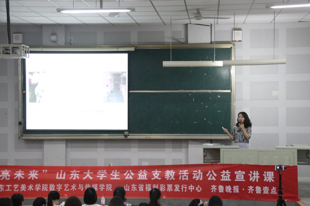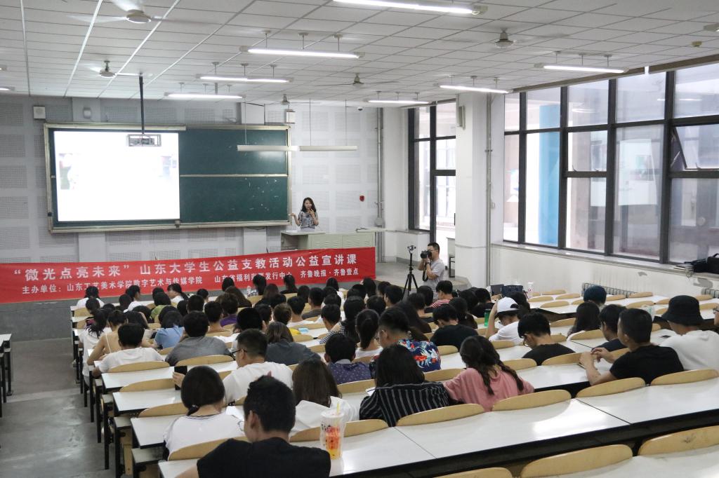 2018年7月3日下午6点半,由山东工艺美术学院数字艺术与传媒学院、山东福利彩票发行中心、齐鲁晚报?齐鲁壹点共同主办的“微光点亮未来”山东省大学生公益支教活动山东工艺美术学院公益宣讲在综合楼八合堂开讲。本次活动邀请韩都衣舍电商集团无穷花开公益项目组负责人彭菲老师主讲,数字艺术与传媒学院17级全体学生参加。