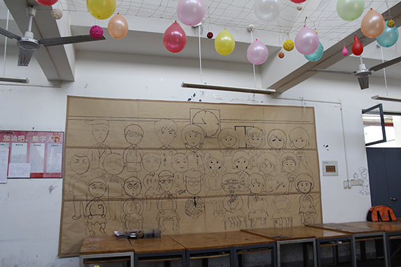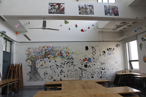 动画二班主题“小爱汇成大爱”手绘墙的设计了一个班的集体成员每个人的形象通过动画展现出自己班的独特风格。墙上的手绘作品为以后的学习营造了良好的环境。