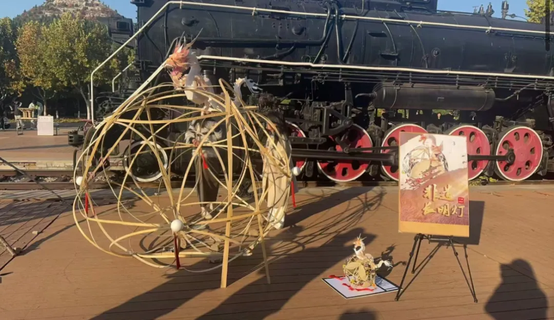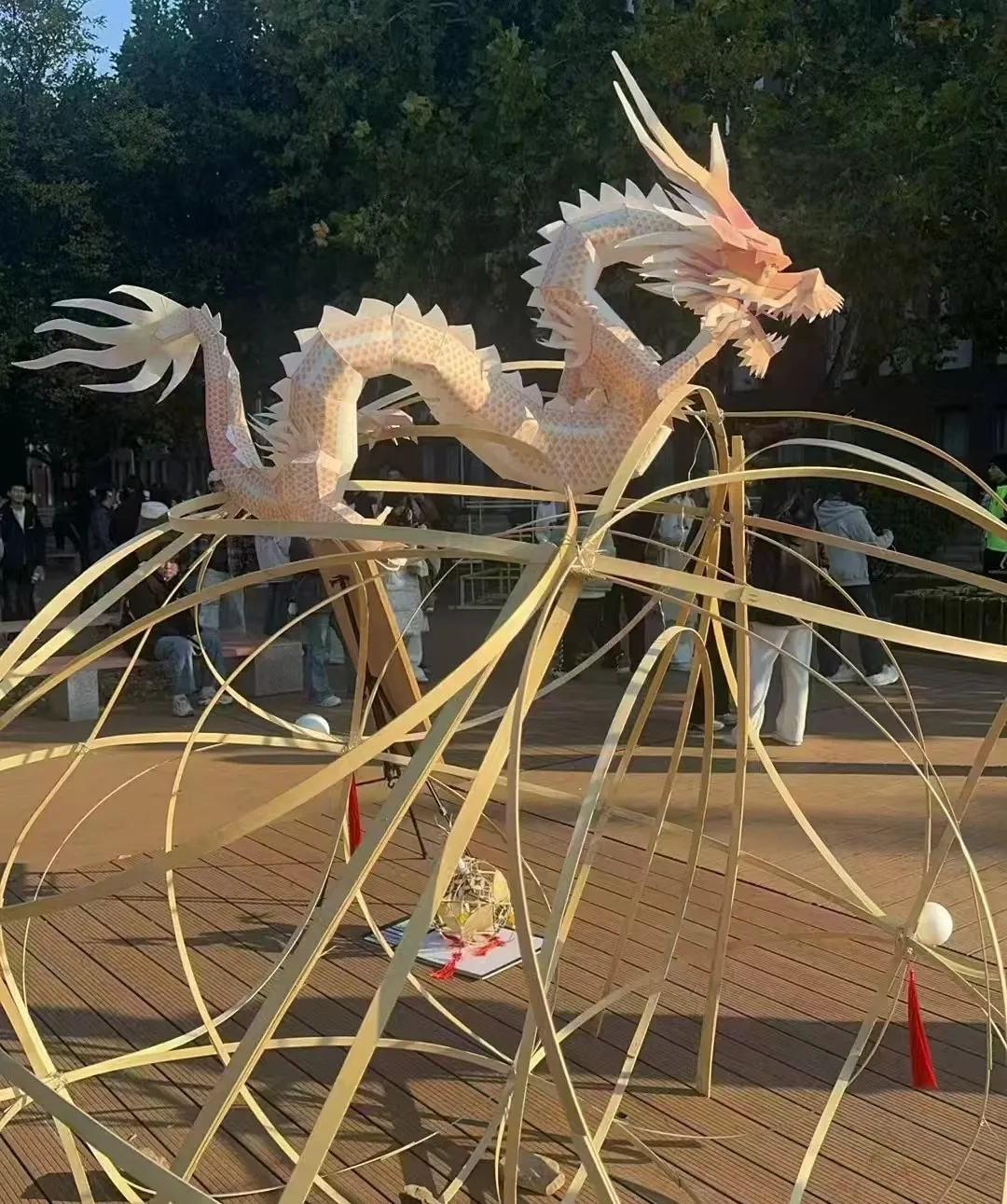《非遗长明灯》以中国非遗滚灯为主体,结合中国龙形象,配同色系流苏点缀,滚灯象征动态与生命力,而龙作为中华文化的精神图腾,彰显稳重与威严。以毛竹、纸板、丝绢等为原材料,以滚灯状支架为载体,外观点缀着含非遗元素的手工作品,朴素自然且有文化内涵,二者组合体现非遗多样性与包容性,传递出“长明不息”文化信念,展现中国文化精妙工艺和艺术风采,传达参赛选手对非遗传承的信念。