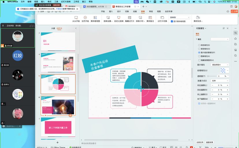 在寒假安全教育方面,辅导员先是向同学们强调了假期安全防护的重要性,详细介绍了有关宿舍安全、交通安全、消防安全、人身财产安全、饮食安全、网络安全、心理安全、防范传销、防范电信诈骗、防溺亡等方面的注意事项。最后,辅导员号召同学们寒假期间加强体育锻炼,提升身体素质,假期放松自我的同时保障个人的身心健康。