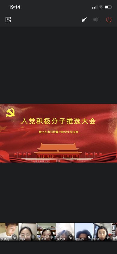 2020年5月18日,数字艺术与传媒学院学生党支部通过企业微信平台召开线上视频会议,讨论确定入党积极分子,会议由我院学生第一党支部书记李灿主持,党总支副书记李清华、学生第二党支部书记郑静以及全体学生党员参加。