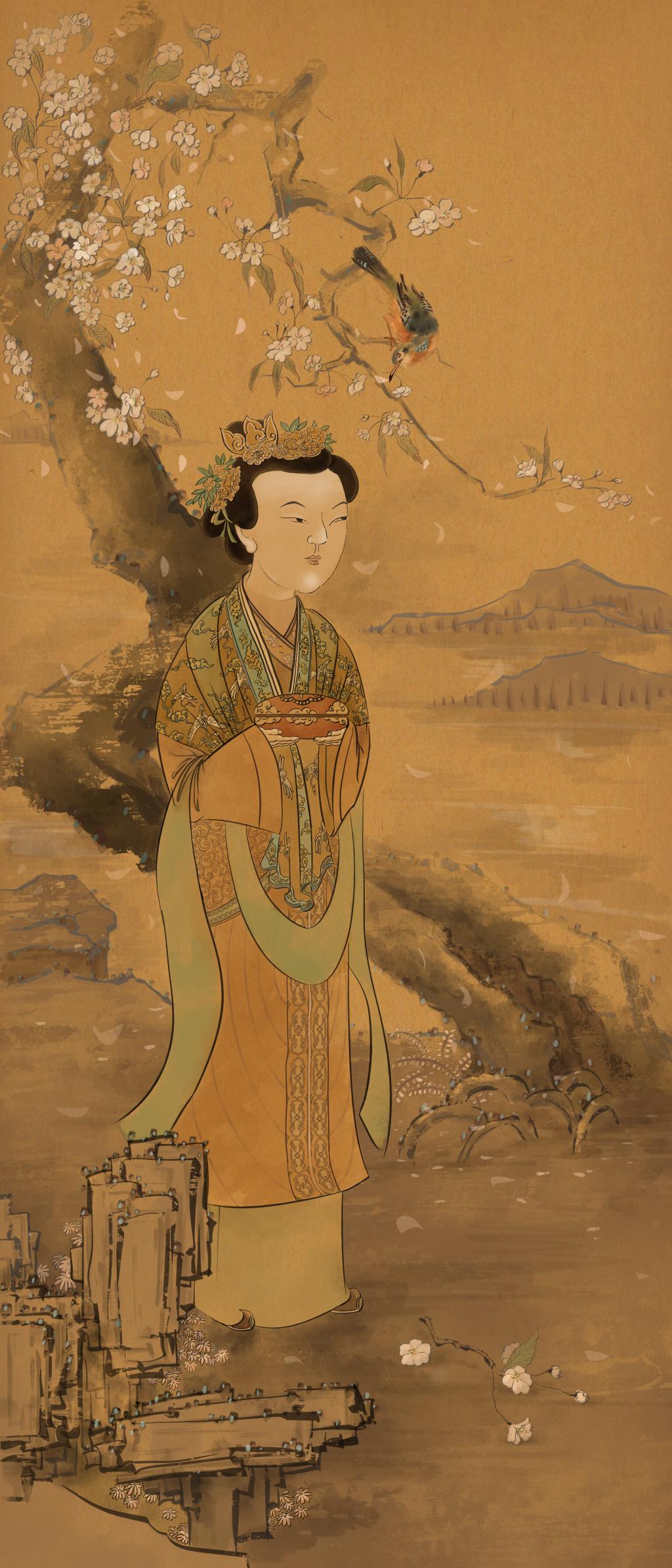 《捧盒仕女图》作品通过ipad procreate板绘制。作品根据1954年山东曲阜杨家院出土的金代?白釉加彩女俑进行创作,用中国传统绘画的手法加上自己的想象,褪去文物残破的现状将其还原出自己心目中素丽的样子。女子脸颊运用了唐代人物的画法—额头鼻尖下巴点白来表达。人物的发簪和服饰则运用了仙鹤、祥云等传统纹样,以黑线勾勒眉、眼、发、服饰轮廓等,场景运用了枯墨、浸染、粗笔等手法?;嬷信铀峙醴酆杏谛厍埃篷嗳棺匀黄荩⒃诳一ǖ氖髑?,枝头的鸟儿嘴中叼着桃花望向女子,勾勒出一派恬淡美好的图景。