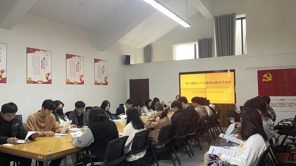 首先,全体党员在支部书记的带领下,认真学习了《中国共产党第二十次全国代表大会报告》,并由学生党员代表王志刚领读报告中习近平总书记对青年的殷切寄语。党员们纷纷表示,在日后的学习工作中要坚持理论学习武装头脑、勤学苦练锻造专业本领,以“争做螺丝钉”的精神在祖国需要的角落闪闪发光,将自身命运与党和国家的命运紧密相连。