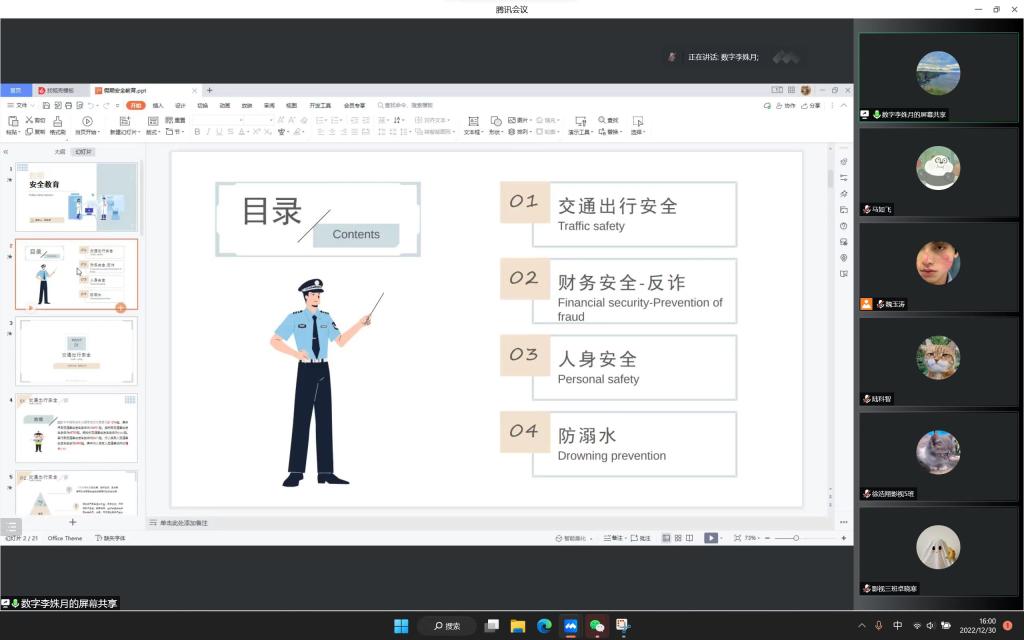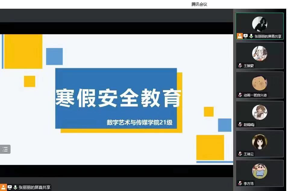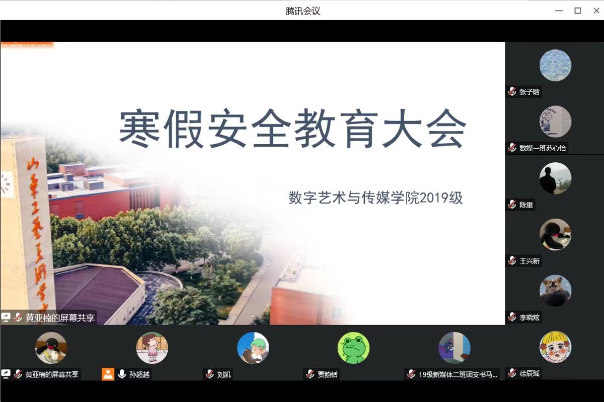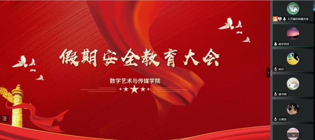 岁暮天寒,寒假已至。为切实做好2023年寒假期间我院学生安全防范工作,提高同学们的安全意识和自我防护意识,保障同学们寒假期间生活和学习安全、平稳、有序地进行,数字艺术与传媒学院各年级召开线上寒假安全教育主题大会。