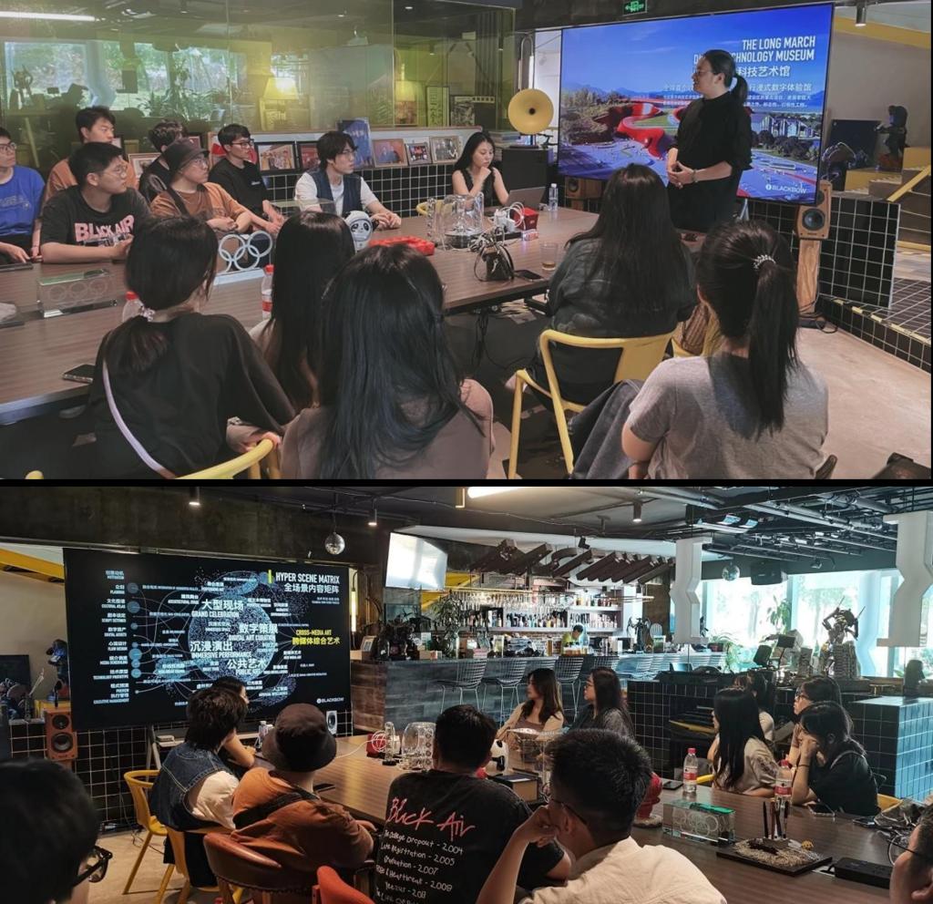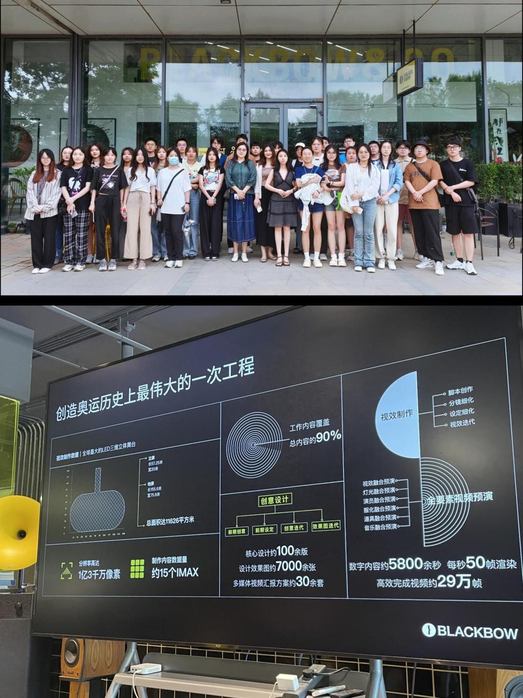 6 月 3 日 2020 级游戏艺术设计班师生抵达黑弓文化传播有限公司,黑弓创始人王志鸥与品牌总监姜珊对牟堂娟一行的来访表示热烈欢迎,并介绍了公司的发展历史、承接的设计项目、设计理念、设计团队、人才培养、技术实现等一系列取得的成绩。很多设计项目给同学们留下了深刻的印象,比如江珊总监向同学们展示了 2022 冬奥会开幕式的视效设计视频,介绍了从”雨水”倒数到立春环节,如何把二十四节气巧妙的转化为倒计时形式。首创水墨动画视效来演绎“黄河之水天上来”的波澜壮阔,展现出一幅兼具中国传统美学与现代科技的新时代图景。实时生成的冰上舞蹈基于 AI 实时特效技术,可实现多个演员的实时位置跟踪,且无需穿戴任何设备。通过对这些实践案例的学习和探讨,开拓了同学们的创作思维和研究视野。