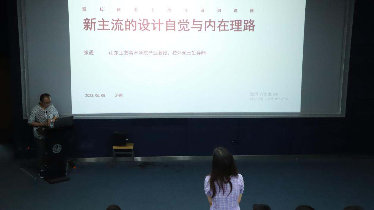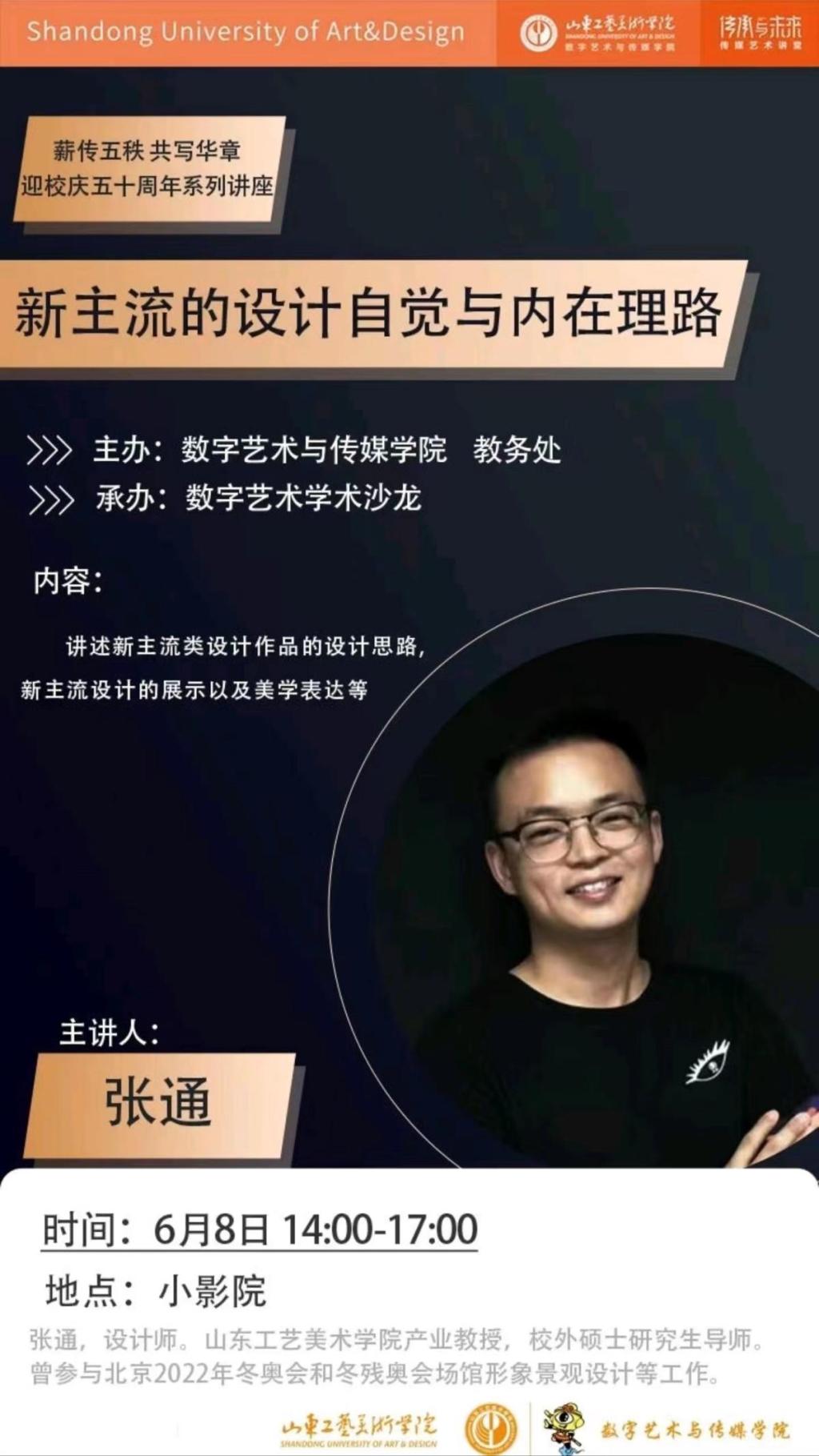 2023年6月8日下午两点,数字艺术与传媒学院在高清放映效果实验室举办了《新主流的设计自觉与内在理路》主题讲座。讲座邀请了山东工艺美术学院产业教授,校外硕士研究生导师张通担任主讲嘉宾。数字艺术与传媒学院副院长张光帅、工业设计学院王俊涛教授出席讲座,数字艺术与传媒学院新媒体艺术教研室主任田金良老师主持本次讲座。