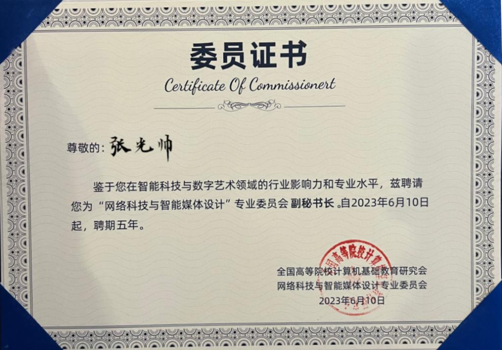本次AIGC高峰论坛由全国高等院校计算机基础教育研究会网络科技与智能媒体设计专业委员会、教育部“数字媒体艺术”虚拟教研室主办,中国传媒大学动画与数字艺术学院、网龙网络公司承办?;嵘希=ㄊ〗逃碧ち踅?,海峡都市报社长兼总编辑黄少鹤,全国高等院校计算机基础教育研究会会长、中国传媒大学动画与数字艺术学院党委书记黄心渊,网络科技与智能媒体设计专委会主任吕欣出席并致辞。全国高校计算机基础教育研究会网络科技与智能媒体设计专业委员会第二届理事会在论坛期间正式成立。我院副院长张光帅、新媒体艺术教研室副主任张牧、动画专业教师史吾轩、戏剧影视美术设计专业教师邓德宽参加会议。会议期间,张光帅当选“网络科技与智能媒体设计专业委员会”副秘书长,张牧、史吾轩当选专业委员会委员。
