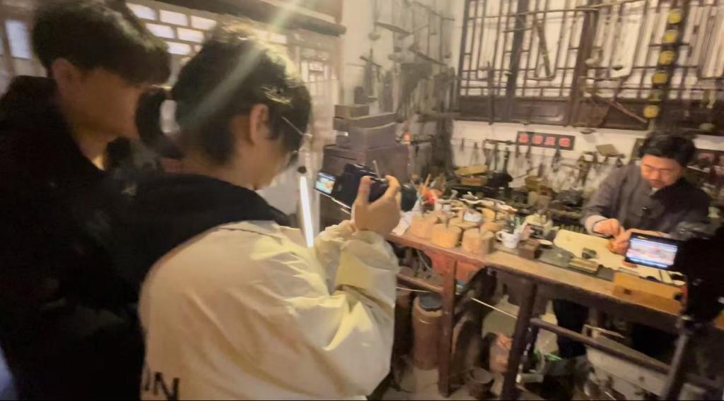 在前期调研结束后,我们小组大约花费了一周的时间进行拍摄,修复工艺与传承创新是主要的拍摄内容。在与耿师傅沟通后,我们纪录了一件紫砂茶壶完整的修复过程。从找碴、捧瓷、制钉到打孔上钉、包镶补口,每一个步骤都十分关键,决定着器物的修复能否成功。并且每一步都要重复很多遍,而不是一蹴而就的,因此即使是修复一件小小的紫砂茶壶,耿师傅也要工作近半天的时间,中途除了吃饭以外也没有休息,可见锔艺并不是一件简单的修复工作。我们拍摄的修复过程原始素材超 5 小时,初剪缩减至 2 小时,精剪保留 近10 分钟的关键工序。研学活动重点拍摄耿师傅与前来学习的学生之间的互动,聚焦于技艺的传承。影片前期修复部分节奏舒缓,后期传承部分节奏逐渐加快。影片以橙黄色为主色调,营造温暖平和氛围,强化“匠心”主题。声音方面保留修复工具声、采访人声,剔除环境杂音,确保清晰自然,让拍摄的画面更加真实。配乐选择上,前期修复段落搭配舒缓中国风音乐如葫芦丝等,后期传承部分采用激昂旋律,结尾选用吉呈轩现场循环播放的主题音乐,增强地域特色与情感共鸣。