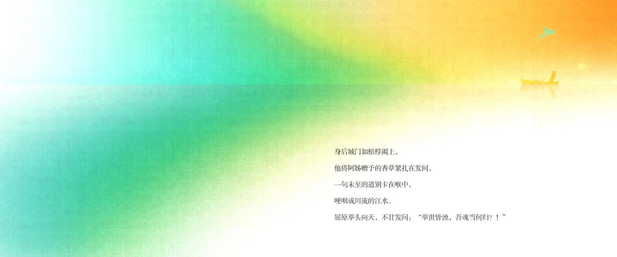 对于我来说,设计中最困难的部分,在于如何用现代语言诠释屈原的精神内核。当AI技术生成的蝴蝶在屏幕上飞舞时,我突然意识到:屈原的“上下求索”不仅是对楚国的忠诚,更是人类永恒的精神困境。于是在动态视频里,我让屈原的形象在投江场景中逐渐幻化为蝴蝶——这不是对悲剧的逃避,而是用楚文化“灵魂不灭”的观念,赋予他的理想以当代性的延续。这种处理源自对屈原角色的理解:他的伟大不在于殉国的悲壮,而在于明知不可为而为之的精神韧性,这恰是我们这个时代依然需要的力量。