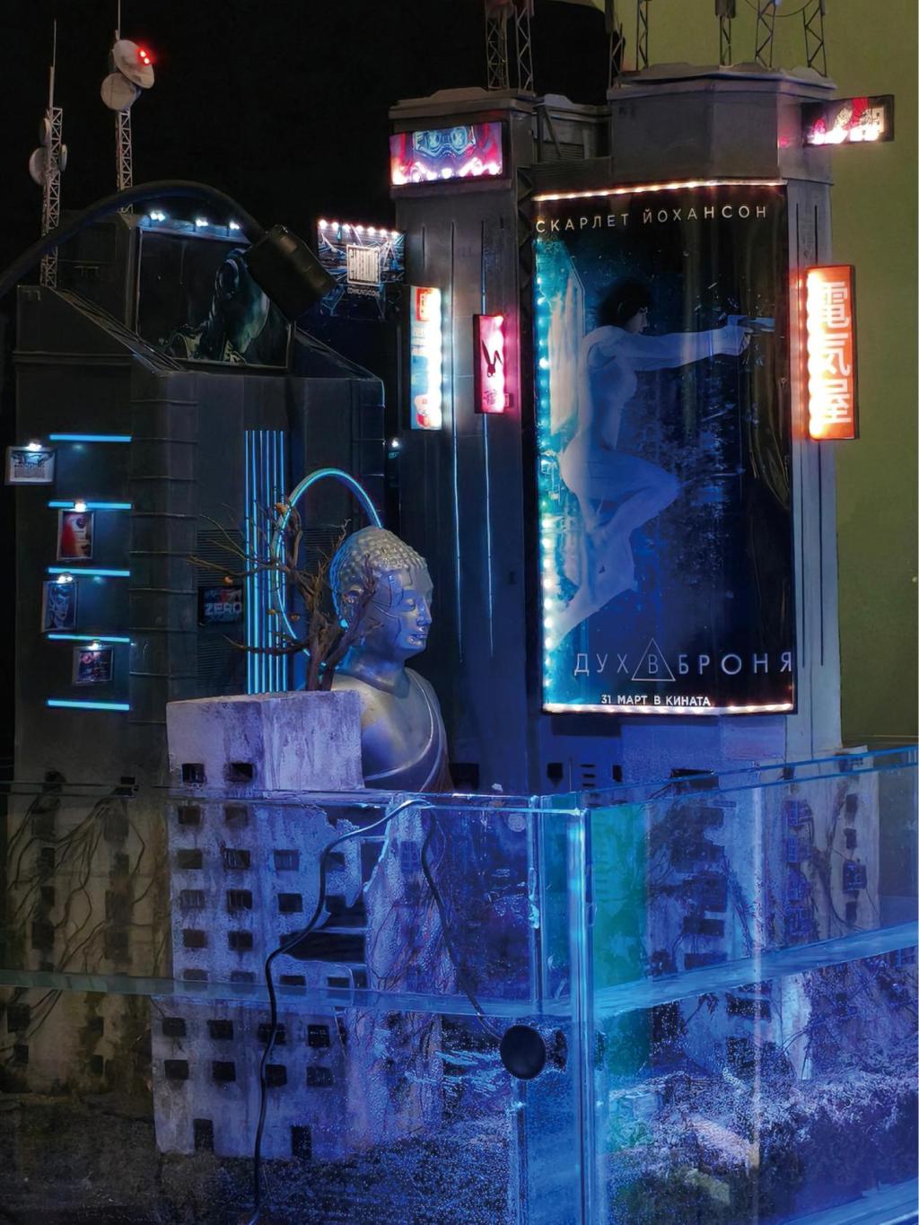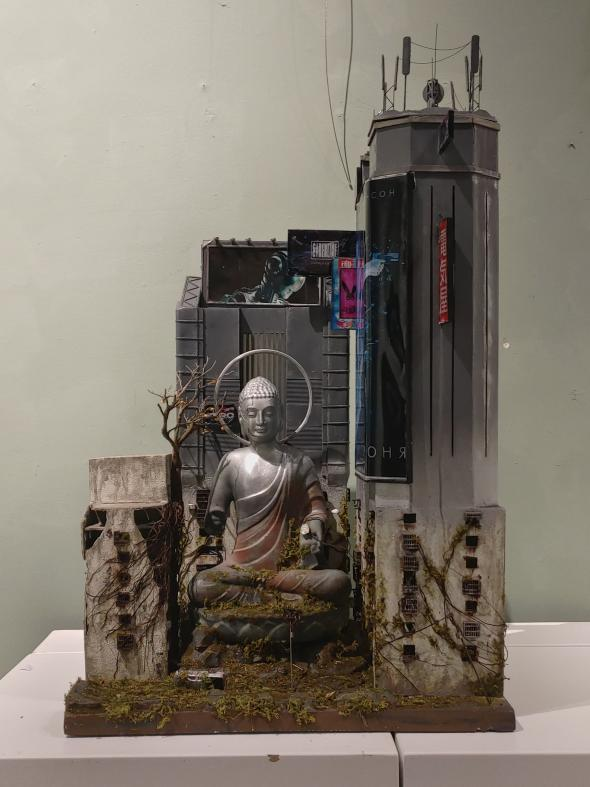 作品简介:本作品主要以三峡水利枢纽工程建设期间重庆被淹没的老城区为灵感来源,想体现山城的老旧回忆与如 今繁华都市的时代洪流与变迁。通过建筑的变化构建了一个历史与未来共存的异托邦。下部是斑驳的老旧小区,上部是霓虹闪烁的赛博朋克建筑,两者被一片镜面般的水面截然分割,却又通过一尊静默的佛像彼此连接。