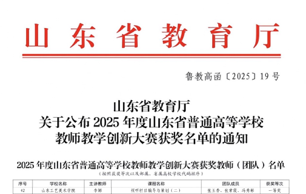 近日,山东省教育厅公布2025年度普通高校教师教学创新大赛获奖名单。我院广播电视编导专业教师李娜、张玉香、张常霞、冯秀彬团队教师表现优异,荣获新文科副高组一等奖,取得学校此项赛事参赛以来最好成绩。