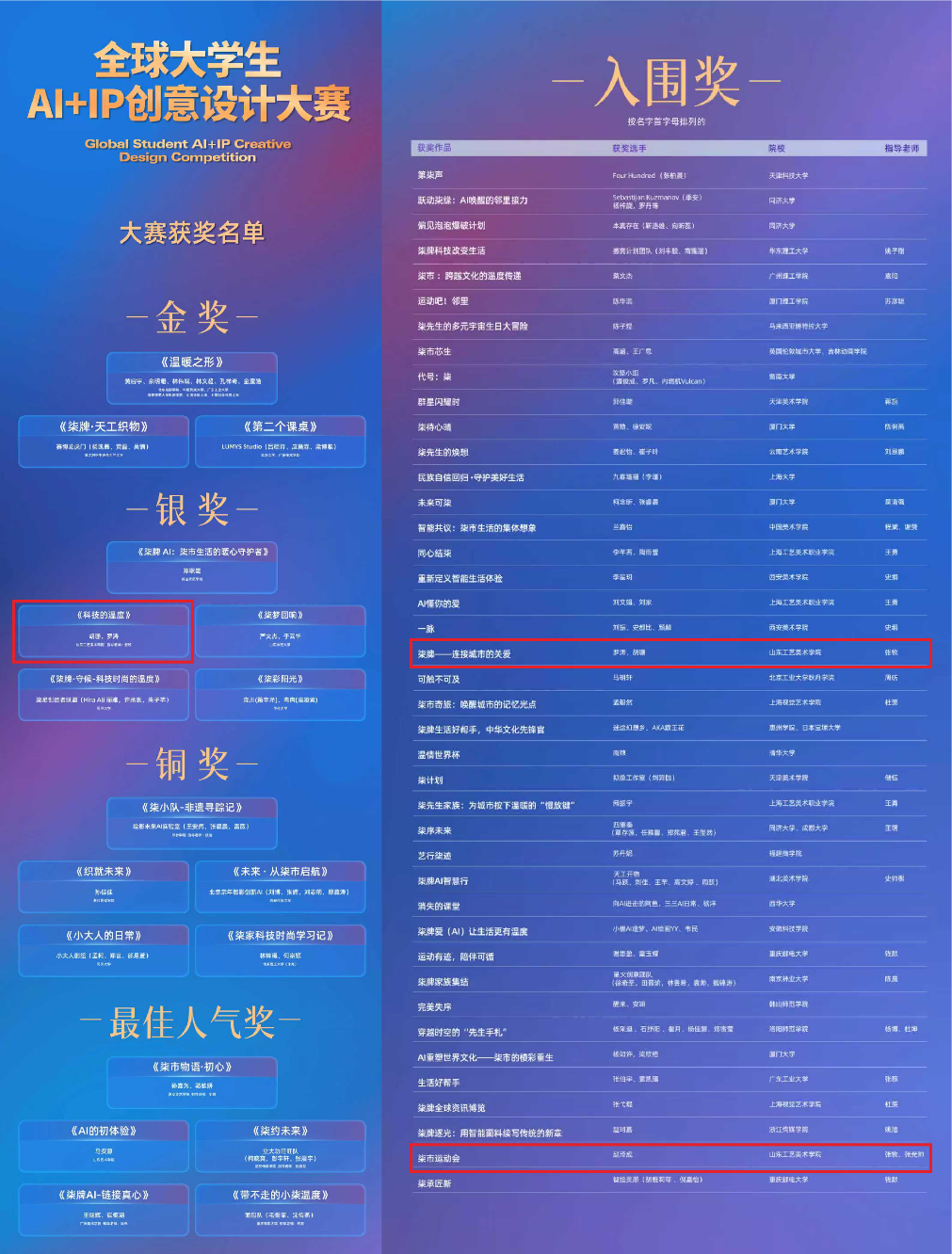 近日,由中国柒牌:福建柒牌时装科技股份有限公司主办,同济大学上海国际设计创新研究院承办的2025全球大学生AI+IP设计大赛正式落下帷幕。数字艺术与传媒学院作品《科技的温度》,从60组决赛作品中杀出重围斩获银奖,同时获得5万元奖金。《柒牌--连接城市的关爱》、《柒市运动会》两部作品获入围奖,分别获奖金6000元。